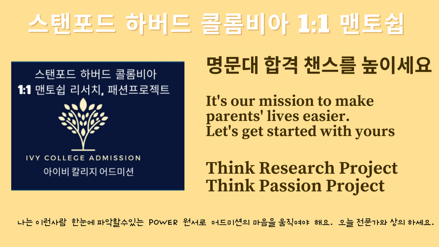스탠포드 하버드 합격생 80% 가 가젔던 이것! 스탠포드, 하버드, 콜롬비아, 예일 1:1 리서치 & 패션, 맨토쉽, Research,